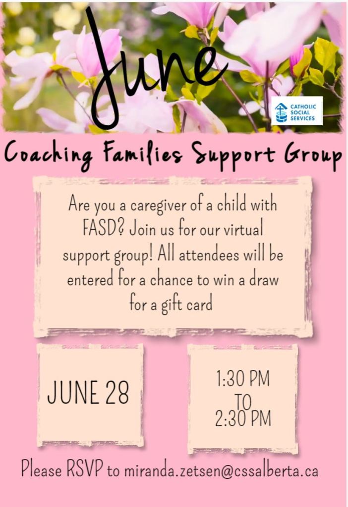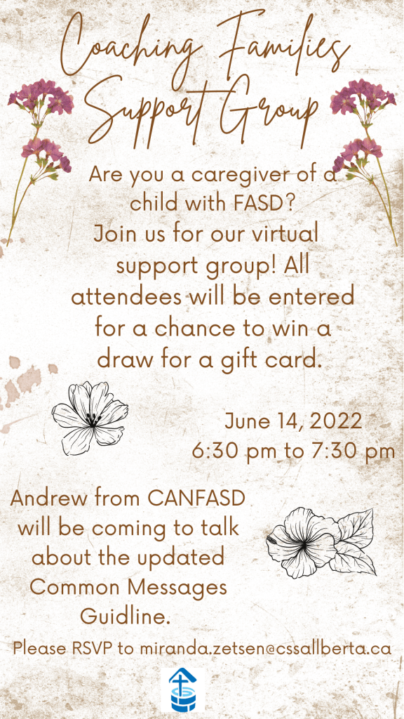 Mark your calendars! The Coaching Families caregiver support group will be held Tuesday, June 14, 2022 and Tuesday, June 28, 2022. For more information or to register please email Miranda at Miranda.Zetsen@cssalberta.ca