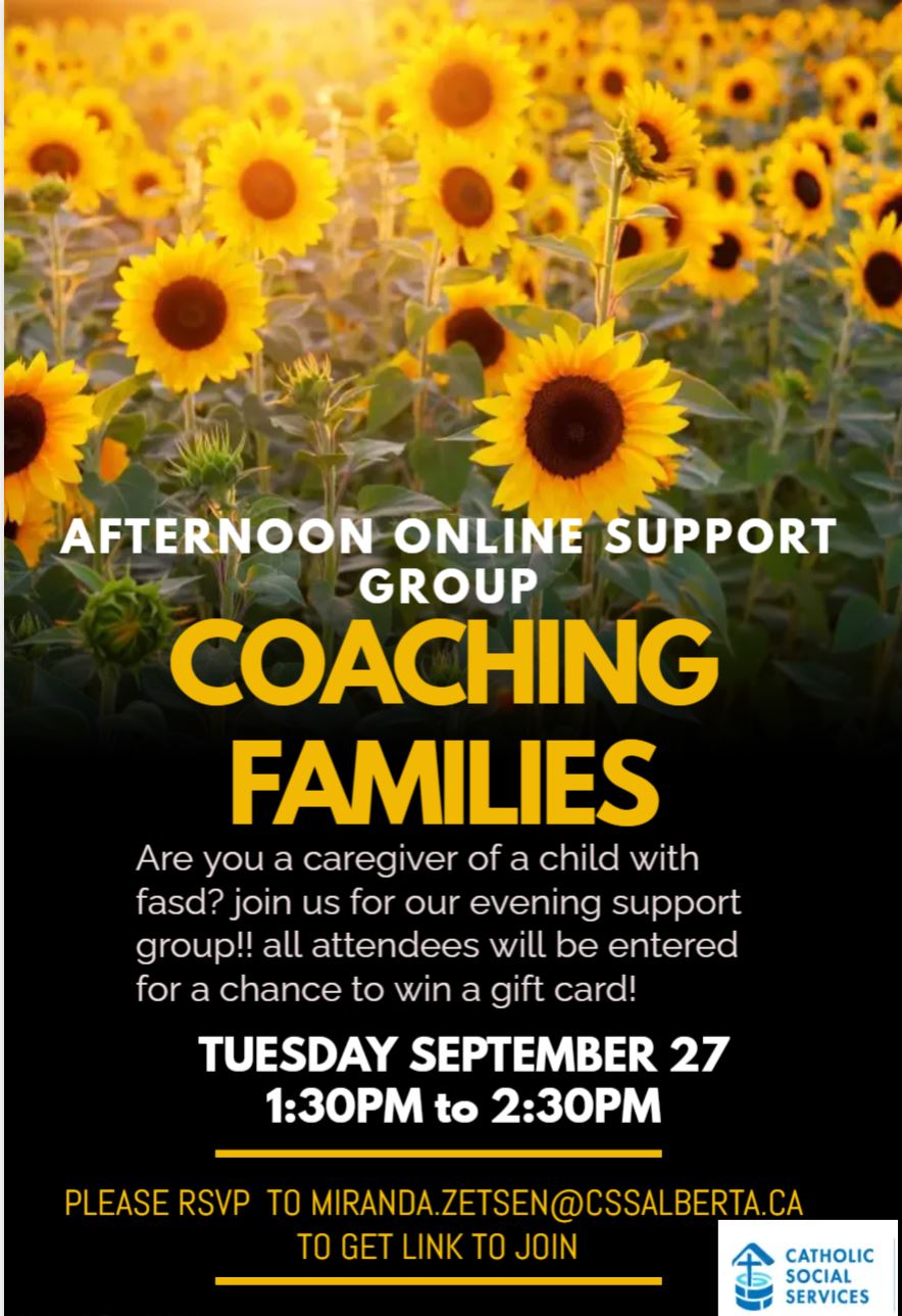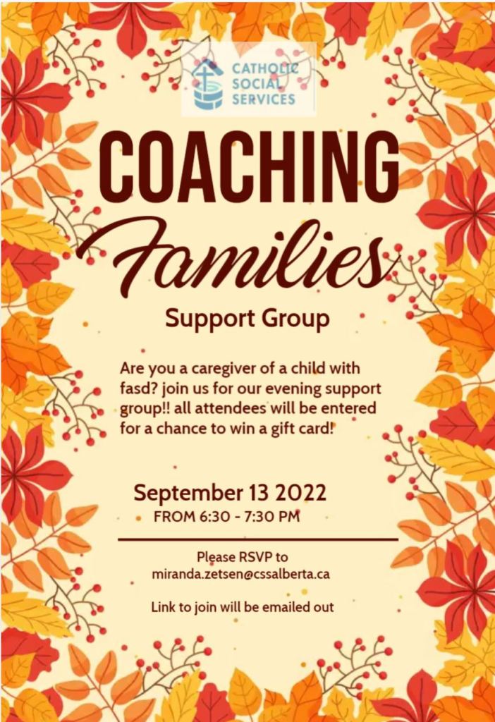 Mark your calendar! The Coaching Families virtual caregiver support group will be held on Tuesday, September 13 and Tuesday, September 27, 2022. For more information or to RSVP please email program staff, Miranda, at Miranda.Zetsen@cssalberta.ca