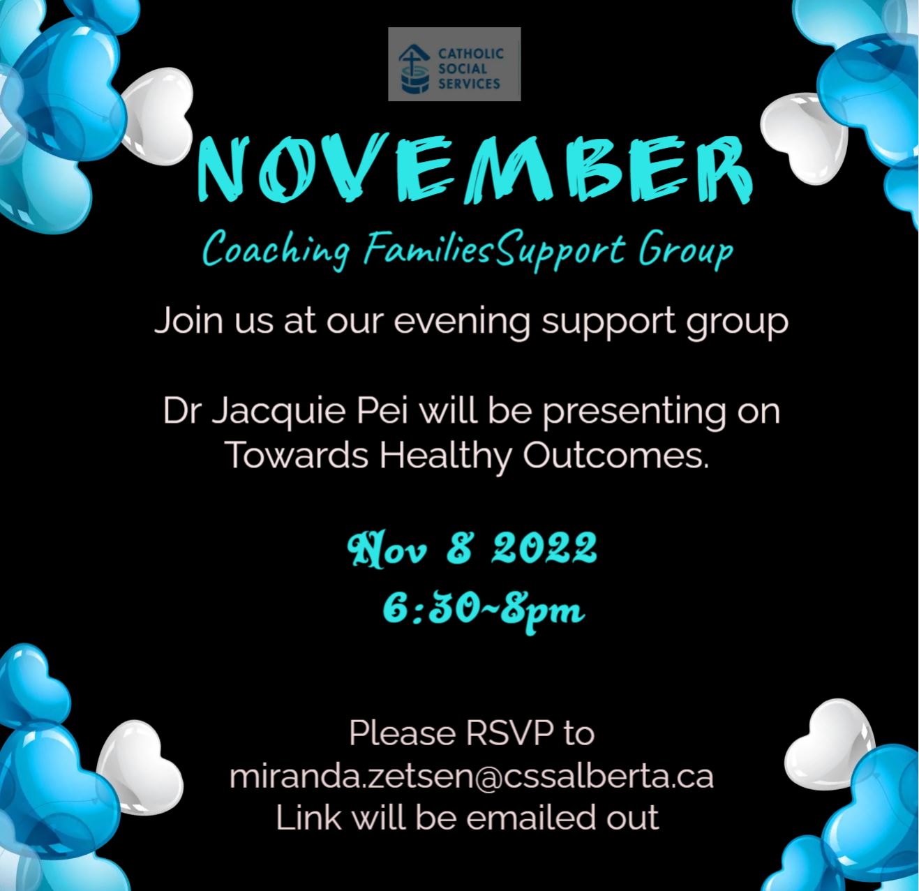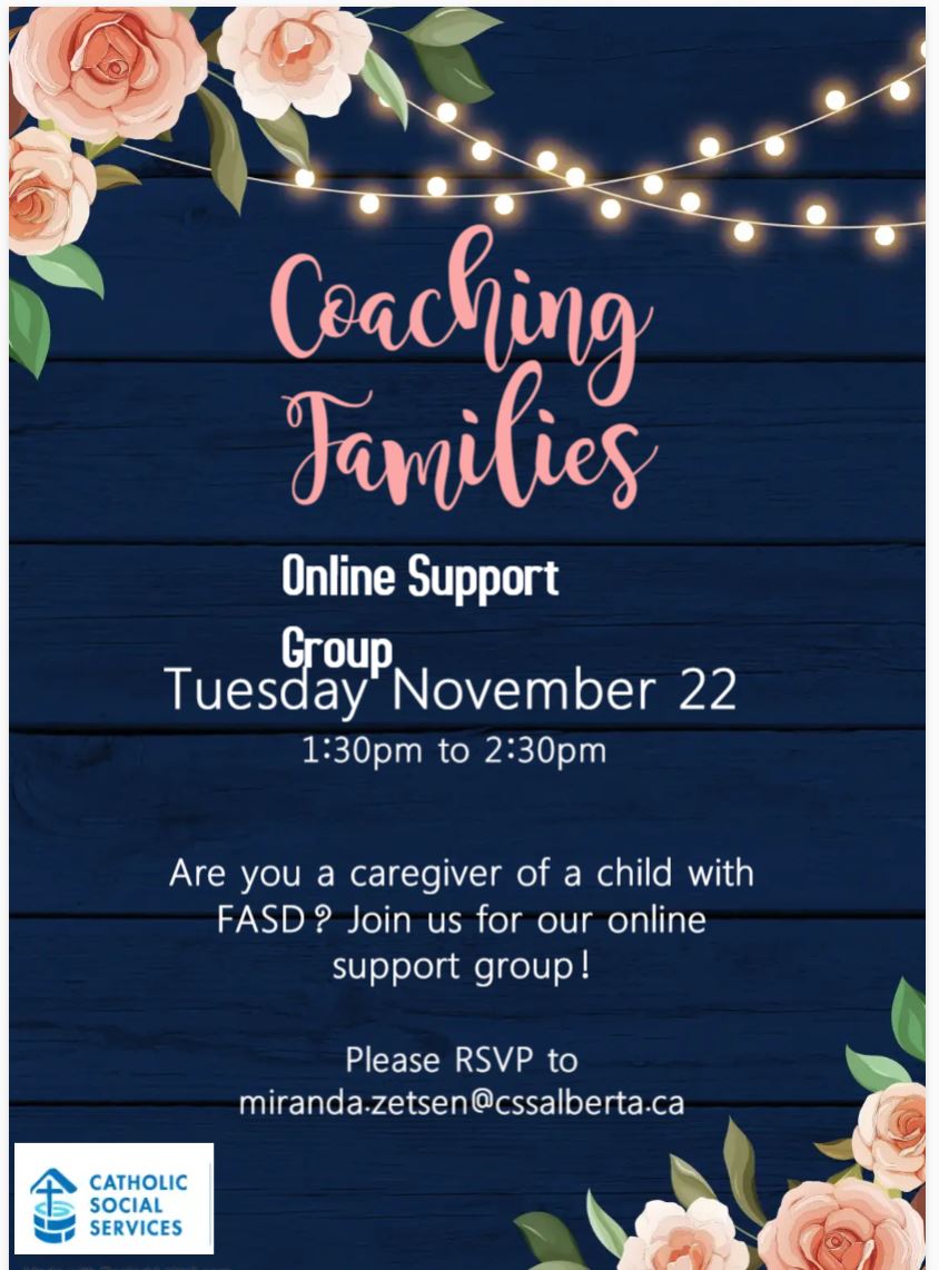 Mark your calendars! The Coaching Families virtual caregiver support group will be held Tuesday November 8, 2022 and Tuesday, November 22, 2022. For more information or to RSVP please email Program staff, Miranda, at Miranda.Zetsen@cssalberta.ca