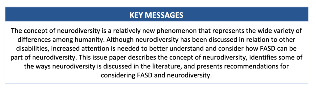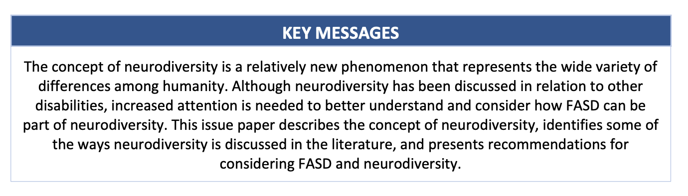 The purpose of this issue paper is to introduce the concept of neurodiversity, identify some of the ways neurodiversity is discussed and framed in the literature, and present recommendations for considering FASD and neurodiversity.